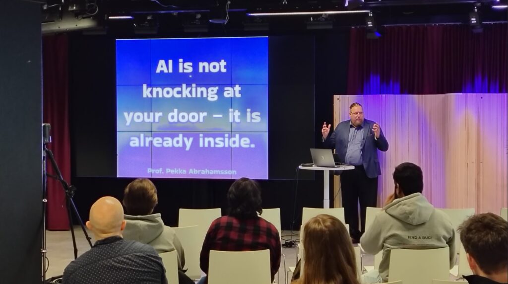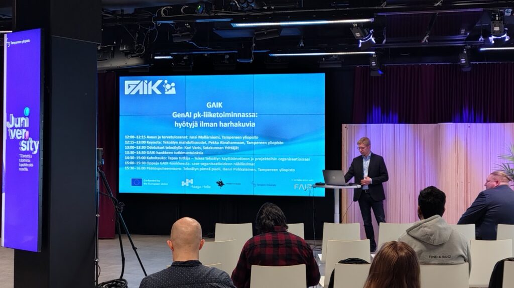 The event was hosted by Jussi Myllärniemi (Tampere University). Keynotes included Pekka Abrahamsson (GPTLab) on the opportunities of AI and Henri Pirkkalainen (Tampere University) on the risks and limitations of AI use.