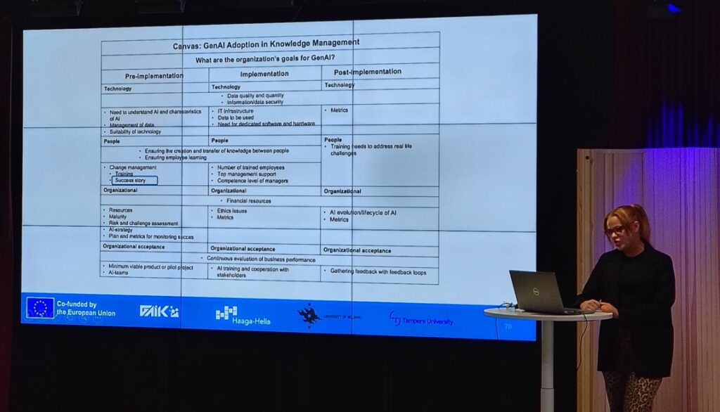 A new version of the GAIK toolkit for GenAI implementation in organizations was presented by Jukka Remes and Janne Kauttonen (Haaga-Helia University of Applied Sciences). In addition, Veera Saastamoinen (Tampere University) presented a toolkit component focused on ensuring successful GenAI adoption in organizations.