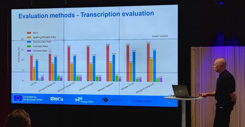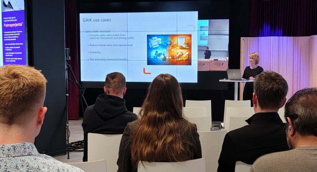 Co-development cases demonstrated concrete applications: Nikke Syväkuru (Luvata) presented AI solutions for automating purchase order processing and simplifying incident reporting, while Jani Korpela (QAdental) showcased tools for automated transcription, translation, and semantic search of video content.